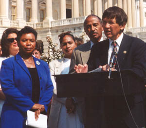 Representatives Barbara Lee (D-CA) and John Conyers Jr. (D-MI) join Rep. Dennis J. Kucinich (right) as he unveils his plan for a cabinet-level Department of Peace. |