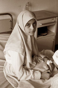 | A young girl with Leukemia waits in an Iraqi hospital for medicine that may never arrive. Will George W. Bush send bombs instead? Credit: Alan Pogue / www.documentaryphotographs.com |