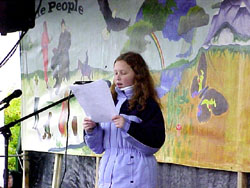 | Twelve-year-old Charlotte Aldebron speaks before a peace rally of 2,000 in Augusta, Maine on October 26, 2002. Credit: Jillian Aldebron |