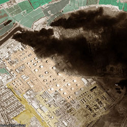 | A satellite photo shows the blanket of poisonous smoke from oil fires set in hopes of defeating US "smart" bombs. Credit: Digital Globe Photo / color-enhanced by The-Edge |