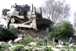 | In Occupied Palestine, a bulldozer as tall as a three-story building eradicates an olive grove. (Note the small, fleeing figures in the foreground.) |