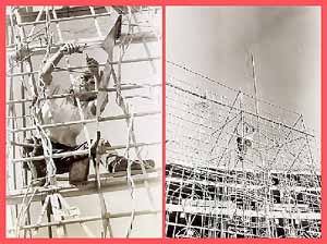 | Left: The author works on a set-piece called "Vesuvius," joining explosive lances with a fuse called "quick match." Right: Jerry Gerth works atop "St. Paul's Cathedral" for a show at the Oakland Coliseum. Credits: Martin Howell; Gar Smith. |