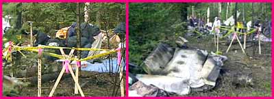 | Most photos of the Wellstone crash site have been removed from the Internet or moved to archives. The photo on the left is from a CNN website. Compare it to the uncropped photo on the left, a Reuters pool photo by Jim Mone, which shows a large part of the plane's wing intact. Aviation fuel is stored in the plane's wings. Note that the wing is only burned where it attached to the fusilage, which suggests evidence of a fire within the cabin. |