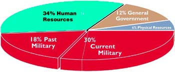 This bogus graphic is still used today but, as George W. Bush recently confessed, his war spending has bankrupted the trillion-dollar trust fund. In Bush's words: "There is no trust." To see the fiscal impact of Bush's confession, strip the nonexistent trust funds from the pie graph (see above). The result: the military's claim on the budget expands from 17 percent to 30 percent. Add the continuing costs of all prior military expenditures and the military's cut quickly climbs to 48 percent of the budget pie. |