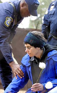 | Quaker activist Joanne Cowan is arrested as she kneels on the lawn at the US Army's School of the Americas. Credit: Mike Hasky / Columbus Ledger-Enquirer |