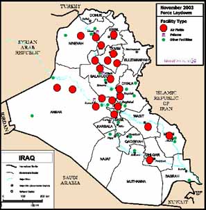 | The US maintains more that 200 military bases in Iraq and is building an estimated 14 permanent bases. The red circles indicate US military airbases. Source: Global Security. |