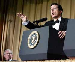 | Comedy Central satirist Steven Colbert holds forth at the podium at the White House press dinner while a visibly annoyed George W. Bush looks on. |
