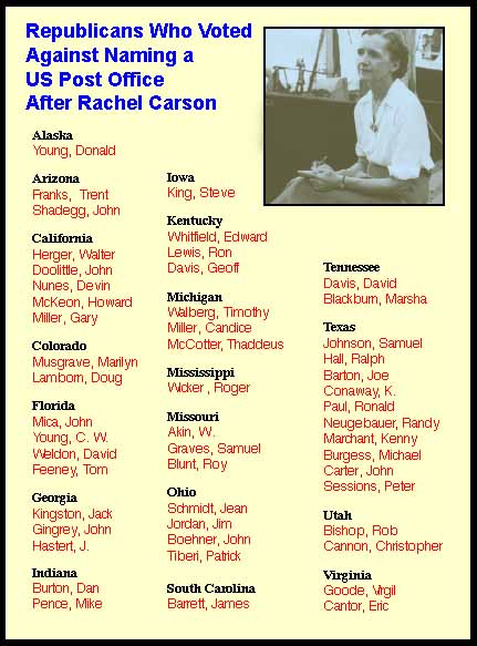 Altmires bill (H.R. 1434) has been moved to the Senate for consideration in hopes that the Rachel Carson Post Office can be approved by May 27, the 100th anniversary of Carsons birth but the move to honor Carson has generated some heated opposition from some die-hard members of the GOP. While renaming a post office seldom makes headlines beyond the local papers, in this case, 53 House Republicans voted against honoring the memory of Rachel Carson, who died of breast cancer on April 14, 1964.