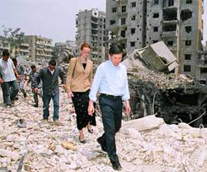 | Elizabeth and Dennis Kucinich tour a bombed-out section of Beirut, Lebanon during a personal peace mission in September 2006. Credit: Photo courtesy of Dennis & Elizabeth Kucinich |