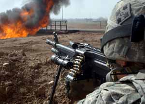 | Pipelines ablaze as US army solider patrols an area that came under insurgent attack near Taji, Iraq. Credit: US Navy photo by Petty Officer 1st Class Michael Larson. |