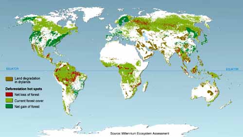 | In 2003, two billion tons of CO2 entered the atmosphere from the deforestation of 50 million acres -- an area of felled forests the size of England, Wales and Scotland. Credit: Map: Millennium Ecosystem Assessment. |